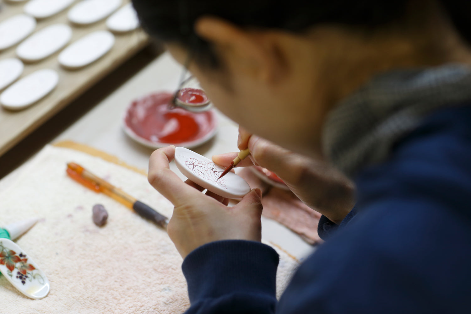 批發商可以說扮演著製片人的角色。在京都,陶瓷器的分工非常發達,形成了原型師、胚師、彩繪師、金箔師等,由各自專業的工匠接力完成產品的製作模式。
