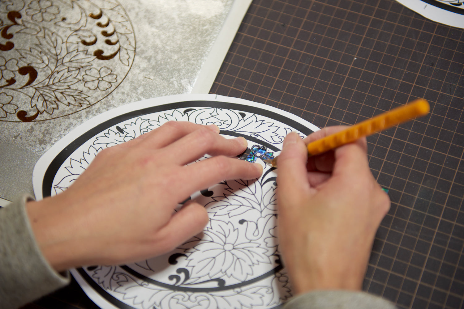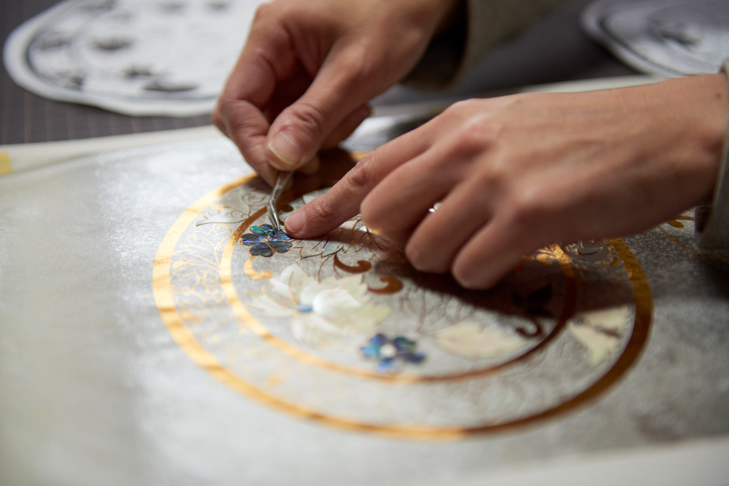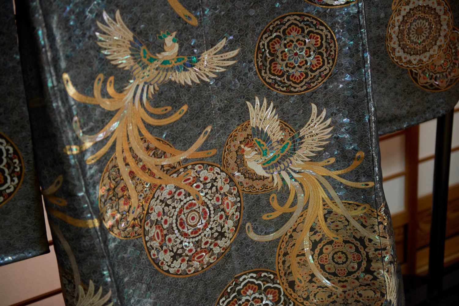 運用需要高度技法的傳統編織技術「敷箔」,將削薄平貼為絲線狀的貝殼一條條的編織完成,面料的表面就好似波光粼粼海面閃閃而亮。這般無與倫比的織品也深受著日本皇室成員的親睞。