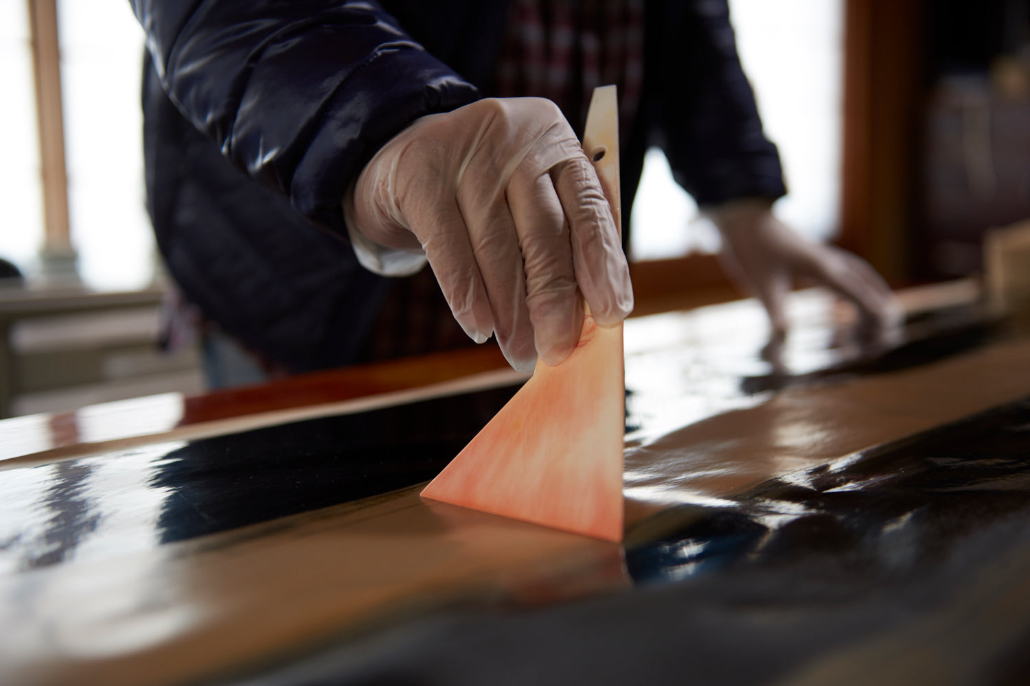 利用"敷箔“的技法將特殊柔化的皮革與絲綢交織編織,製成特殊的編織面料,將其製作成圍巾。